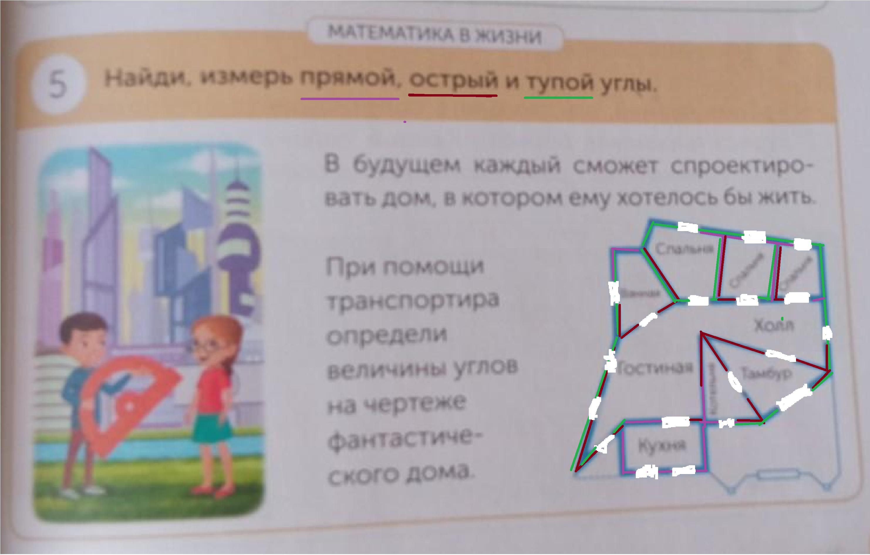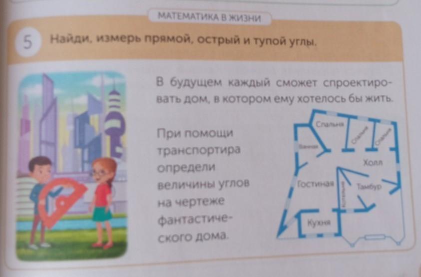 МАТЕМАТИКА В ЖИЗНИ Найди, измерь прямой, острый и тупой углы. 5 и» в будущем каждый сможет спроектиро- вать дом, в котором ему хотелось бы жить. Спальня IT Спальня Спальня Ванная Холл При помощи транспортира определи величины углов на чертеже фантастиче- СКОГО Дома. Гостиная - Тамбур Котельня 10 Кухня как то так