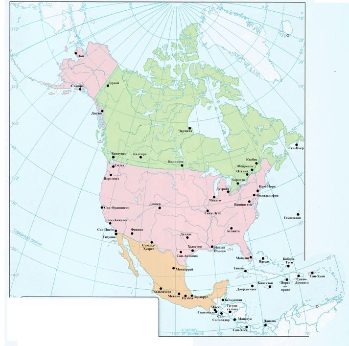 - Закрасить чёрным цветом пунсоны крупнейших городов стран Северной Америки.Карта дана ниже в приложении