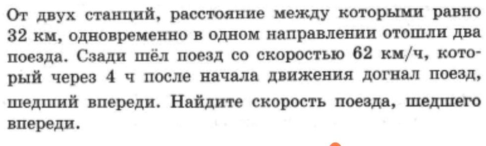 Расстояние пройденное задним поездом до встречи с передним 62*4=248 км. Расстояние пройденное передним поездом до встречи с задним 248-32=216 км. Скорость переднего поезда 216:4=54 км/час.