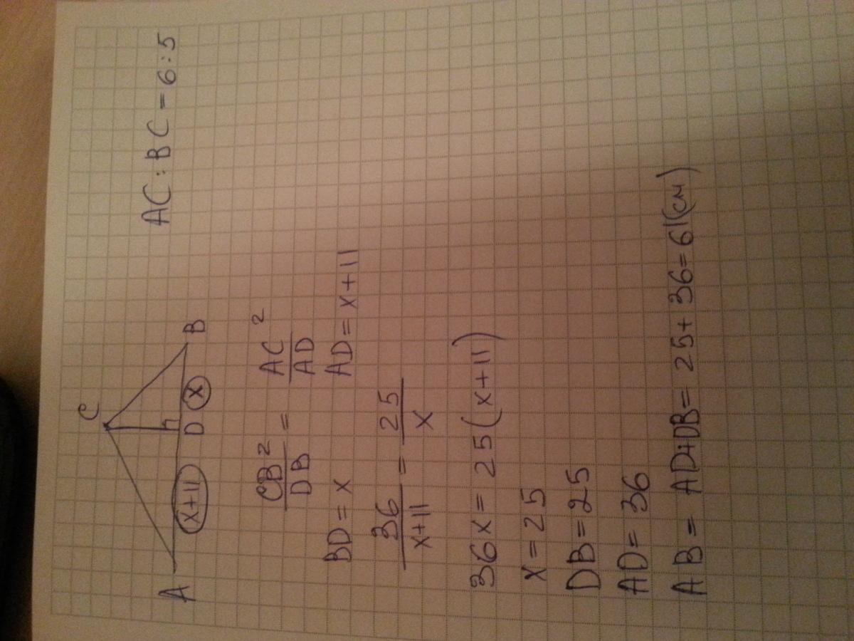 высота прямоугольного треугольника,прведенная из вершины прямоугольного угла ,делит гипотенузу на отрезки,один из которых на 11 см больше другого. Найдите гипотенузу,если катеты треугольника относятся как 6:5