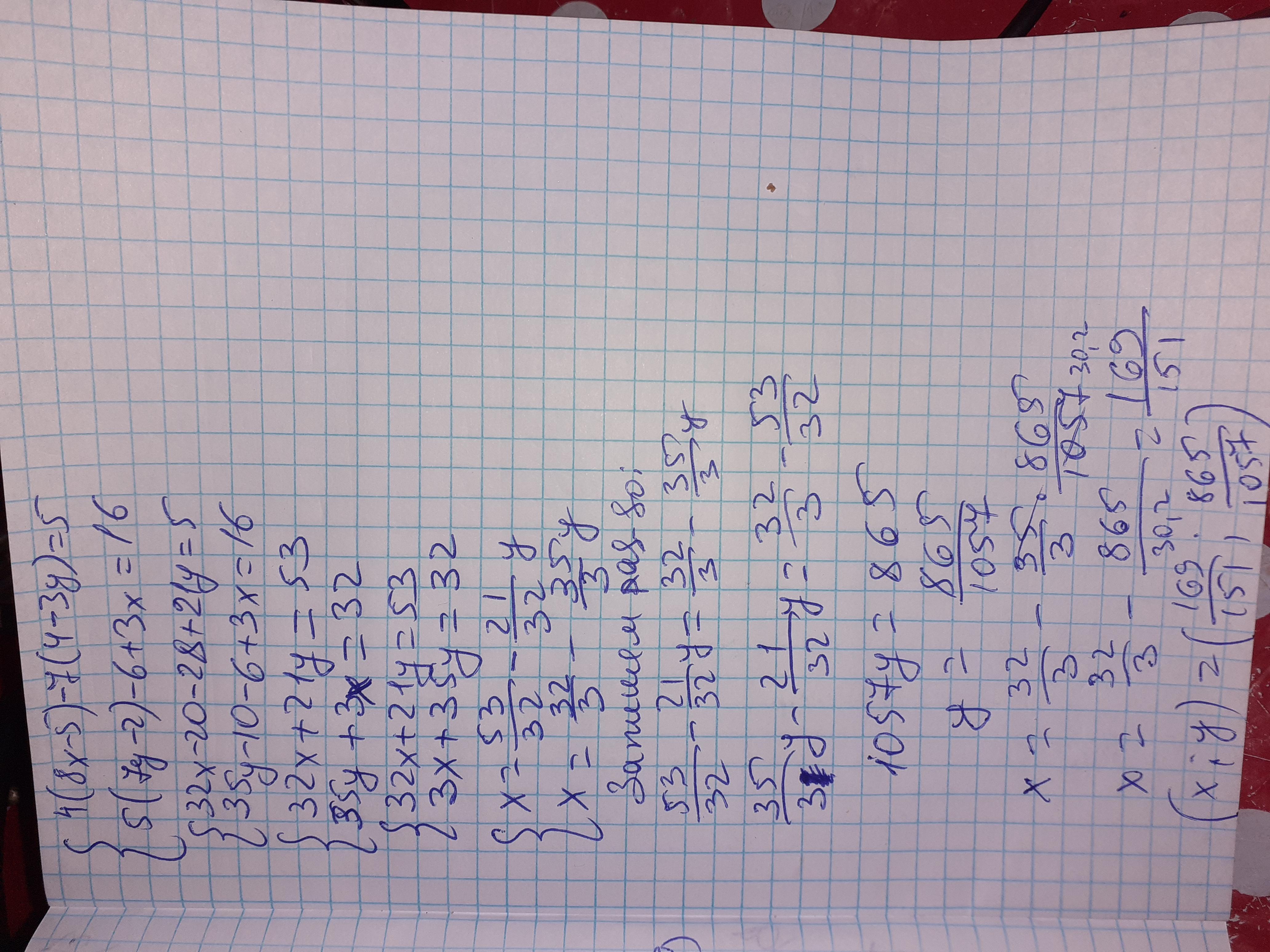 Розв'яжіть систему рівняння.4(8 х-5)-7(4-3у)=5,5(7у-2)-6+3 х=16