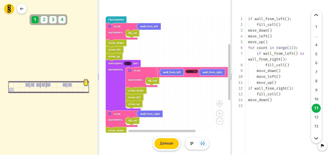 затем используя цикл с параметром (for count in range(13):) и условный оператор с составным условием (if wall_from_left() or wall_from_right():) будем проверять надо ли закрашивать текущую клетку и если составное условие (wall_from_left() or wall_from_right()) истинно, закрашивать её, а потом переходить в следующую клетку