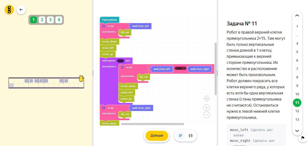 Робот в правой верхней клетке прямоугольника 2×15. Там могут быть только вертикальные стенки длиной в 1 клетку, примыкающие к верхней стороне прямоугольника. Их количество и расположение может быть произвольным. Робот должен покрасить все клетки верхнего ряда, у которых есть хотя бы одна вертикальная стенка (стены прямоугольника не считаются). Остановиться нужно в левой нижней клетке прямоугольника.