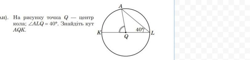 ∠LAQ=∠ALQ=40° (ΔAQL рівнобедрений AQ=QL=радіуси)