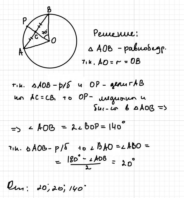 AB- хорда кола з центром у точці О. У цьому колі проведено раліус OB і радіус OP, який проходить чепез середину відрізка AB- точку C. Кут BОР дорівнює 70°. знайдіть кути трикутника AOB