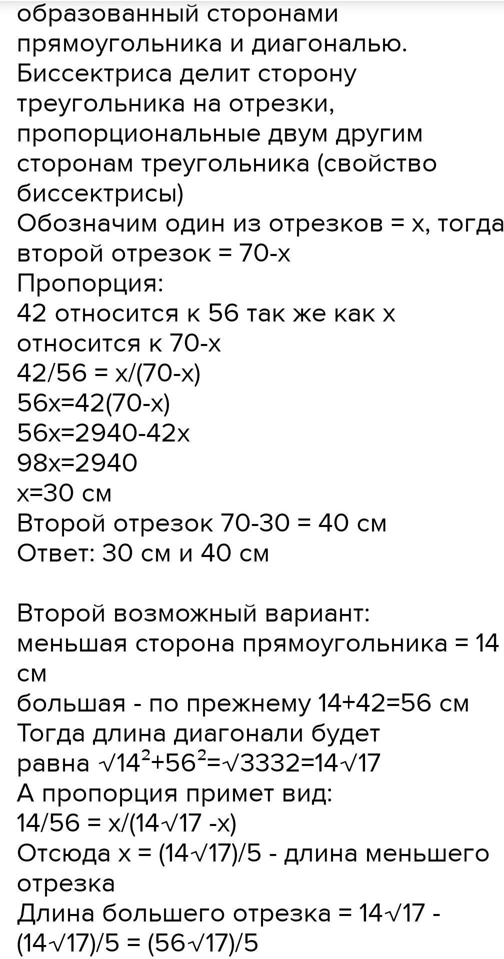 В прямоугольнике биссектриса угла делит диагональ на отрезки 30 см и 40 см. Найдите площадь этого прямоугольника.
