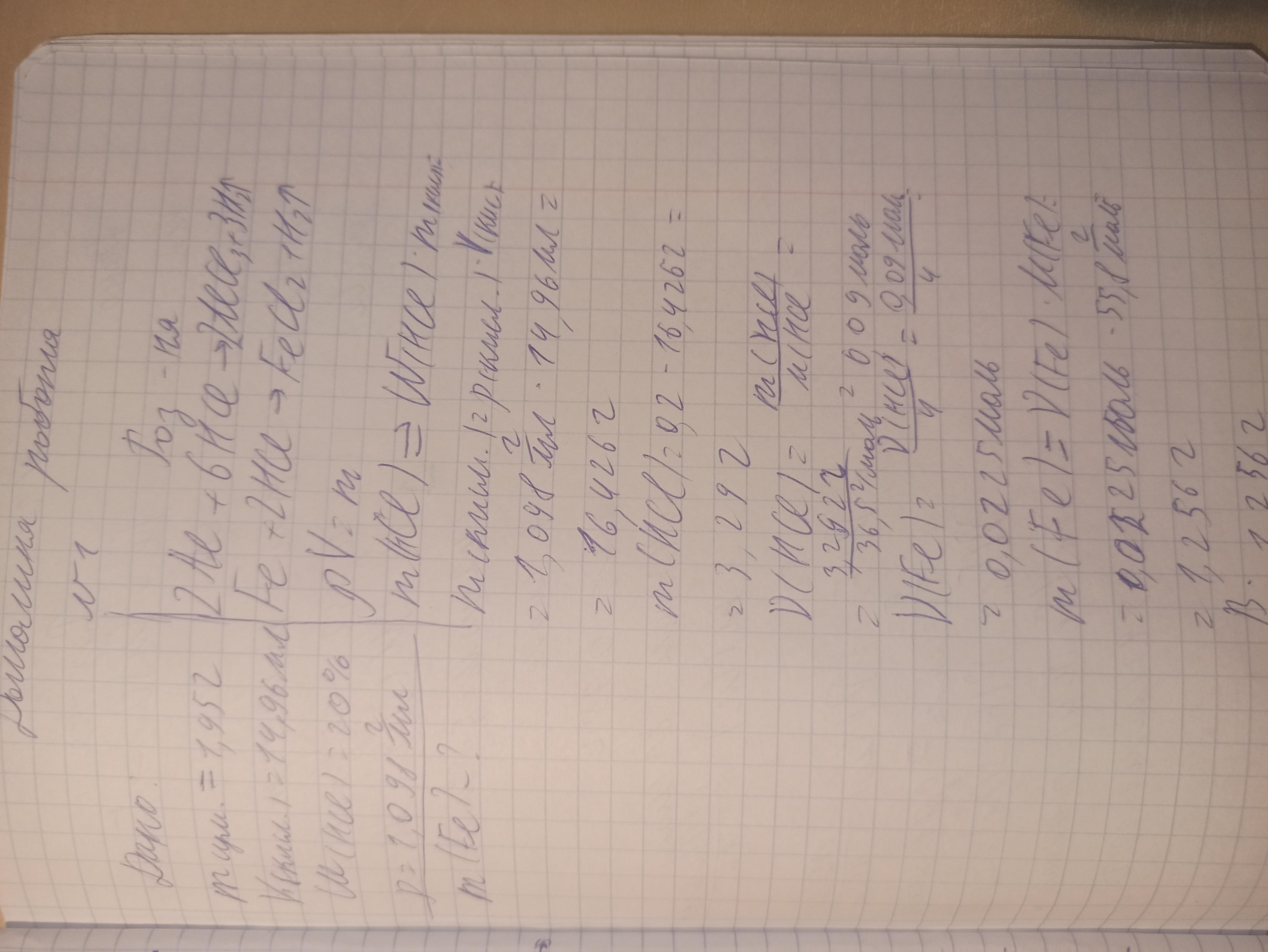 2)На розчинення суміші алюмінію і заліза масою 1,95 г, витратили хлоридну кислоту об'ємом 14,96мл із масовою часткою хлоридної кислоти 20% і густиною 1,098 г/мл. Обчисліть масу заліза в суміші.
