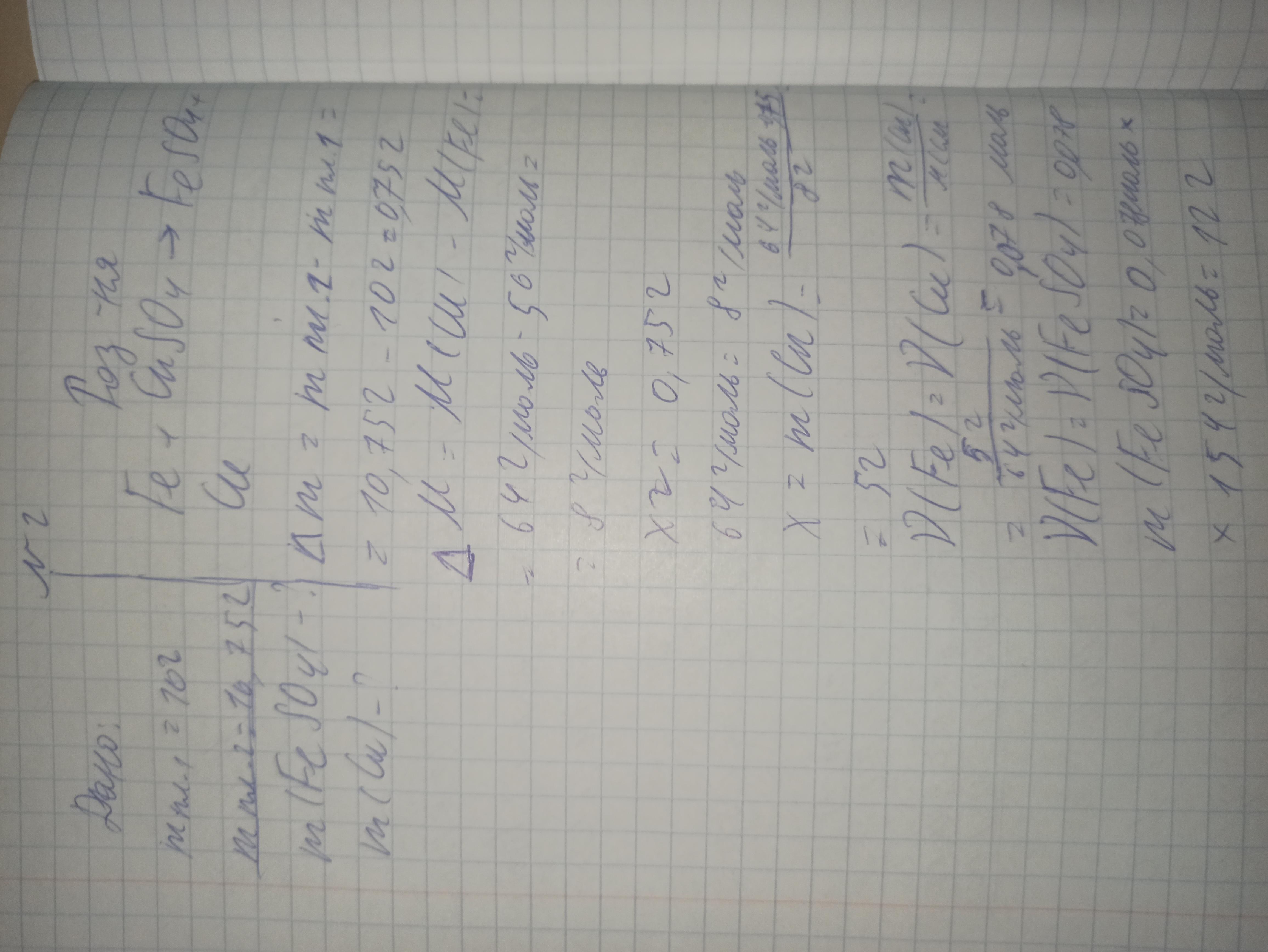 1)У розчин купрум || сульфату занурили залізну пластинку масою 10.0г. Через деякий час її дістали, в сушили та зважили . Маса становила 10,75г. Визначте масу заліза що розчинилася і масу міді що осіла на пластинці.
