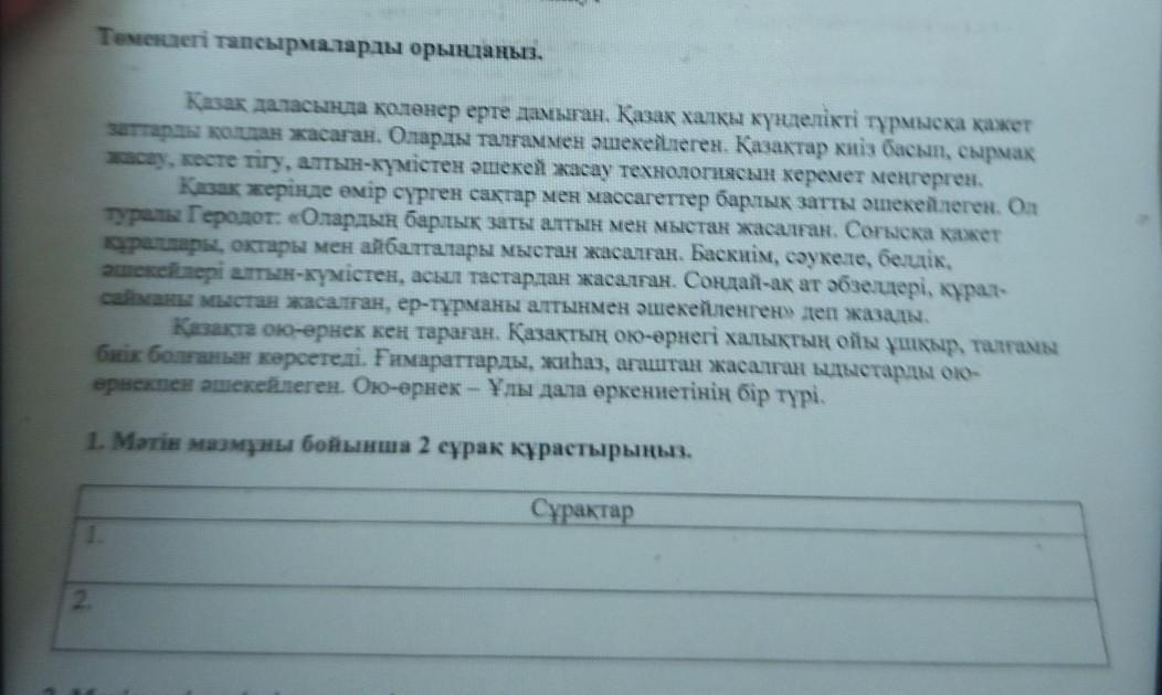 1. Мәтін мазмұны бойынша 2 сұрақ құрастырыңыз. Сұрақтар 1 2.