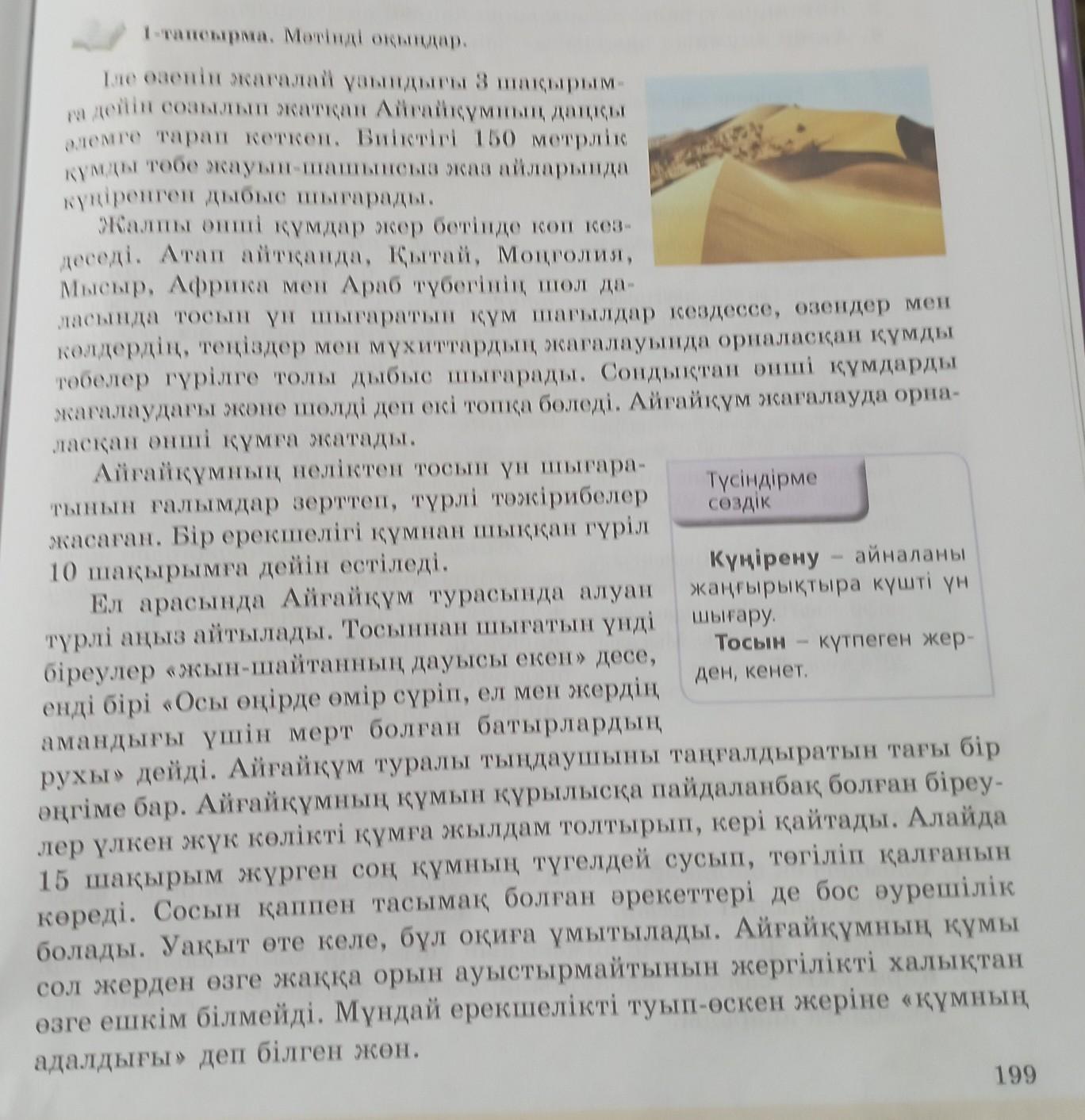 А Мәтін мазмұны бойынша сұрақтарға жауап беріңдер. 1. Айғайқұмға тән қандай ерекшеліктерді білесіңдер? 2. Әнші құмдардың қандай түрлері бар? 3. Айғайқұм туралы ел арасында қандай аңыздар бар? 4. Автор «құмның адалдығы» деп нені айтып отыр?
