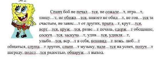 Спанч боб не печалится, не сожалеет, играет, танцует, не обижается, никого не обидит, не гонится за счастьем, не зависит от других, прыгаетя крутится, вертится, кружится, развеет печаль, сдержит обещание, соскучится, заскучает, удивится, удивляет, улыбатся, верит в себя, ненавидит ложь, любит общаться, слушает других, слушает музыку, надеется на успех, получит награду, поделится радостью, обнаружит выход.