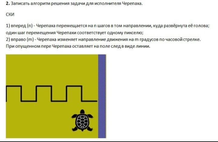 решения задачи для ски 1) вперед (n) - Черепаха перемещается на п шагов в том направлении, куда развёрнута её голова; один шаг перемещения Черепахи соответствует одному пикселю; 2) вправо (m) - Черепаха изменяет направление движения на т градусов по часовой стрелке. При опущенном пере Черепаха оставляет на поле след в виде линии. т E u