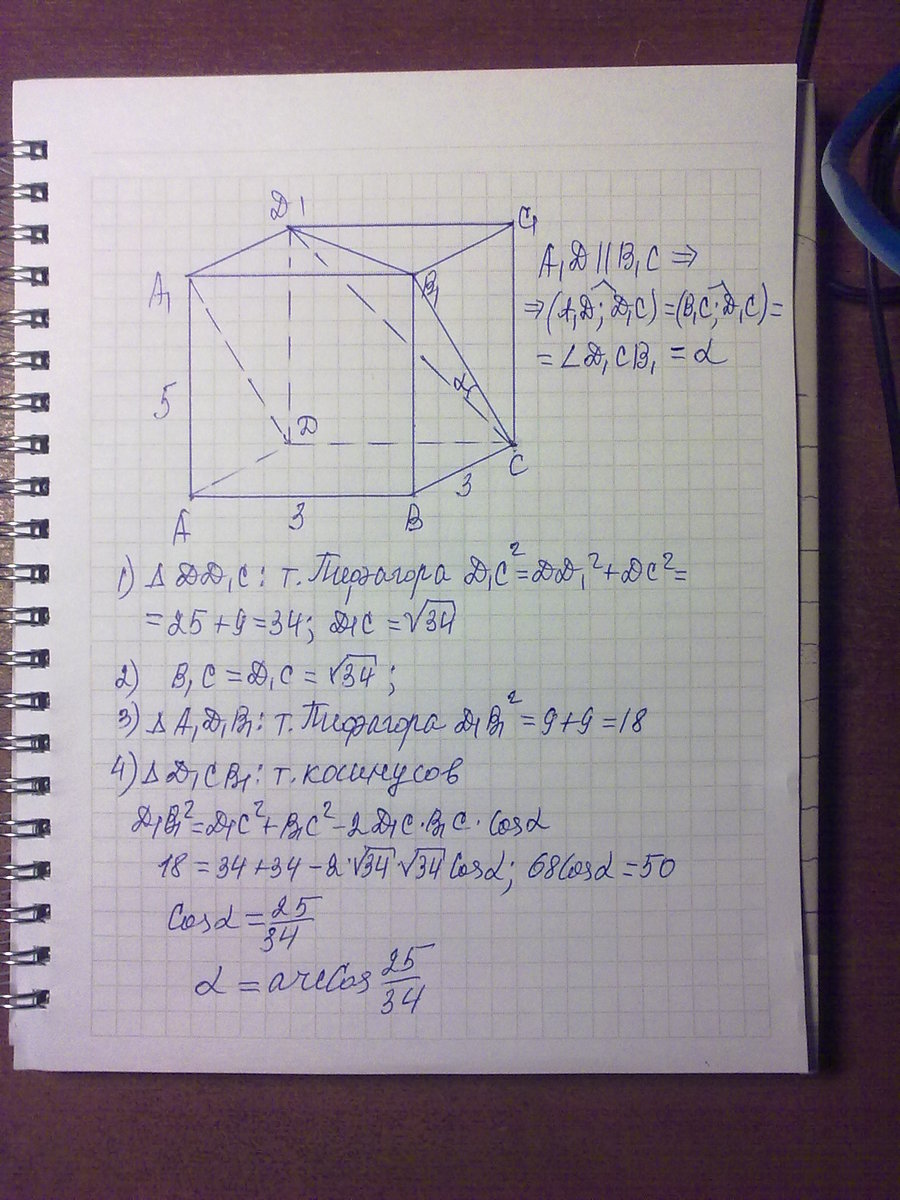 Прямоугольный параллелепипед-ABCDA1B1C1D1,основание которого-квадрат ABCD.Вычислите градусную меру угла между прямыми A1D и D1C , если AB=3 см ,AA1=5 см.