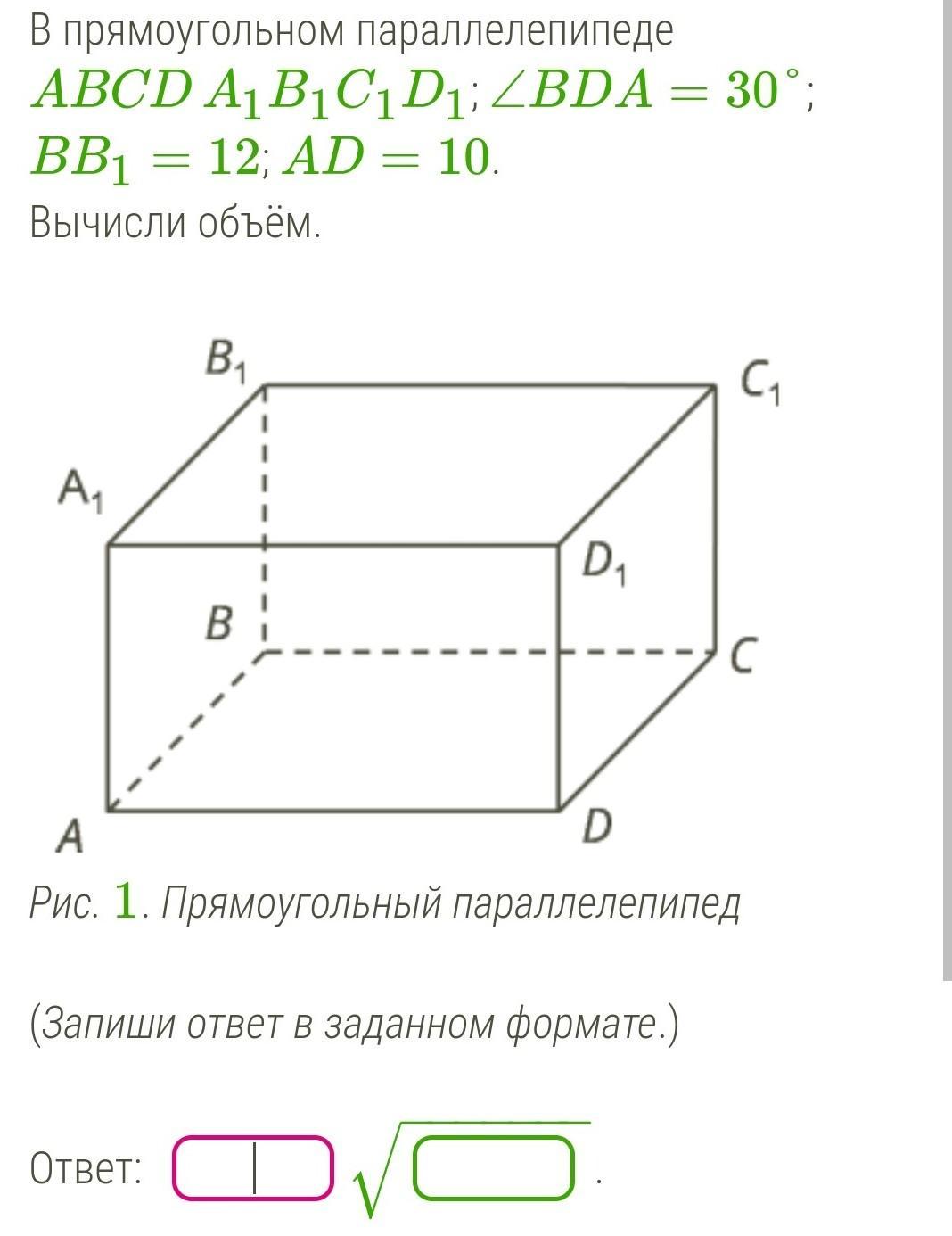 , тогда в треугольнике ABD прямоугольном, так как угол BDA = 30 градусов, то по определению тангенса (и так как в прямоугольном параллелепипеде в основании прямоугольник, то AB=DC):