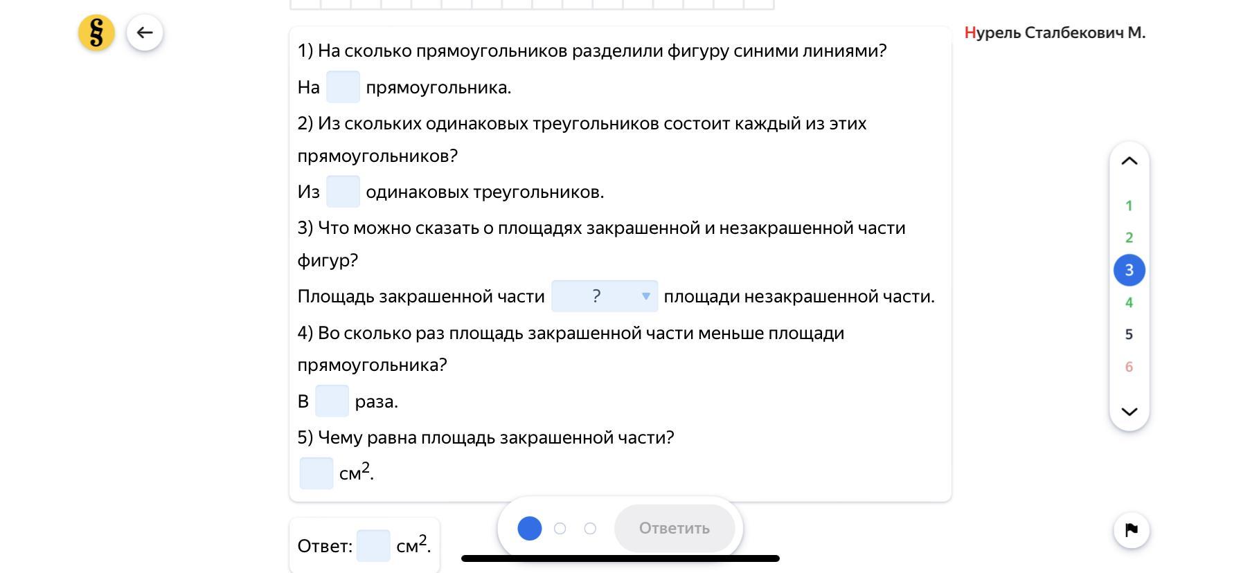 5)Сначала находим площадь прямоугольника,потом треугольники, которые окружают закрашенную фигуру