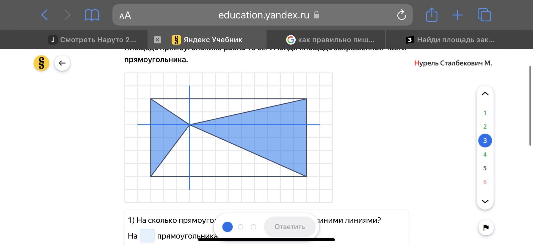 Площадь прямоугольника равна 18 см². Найди площадь закрашенной части прямоугольника