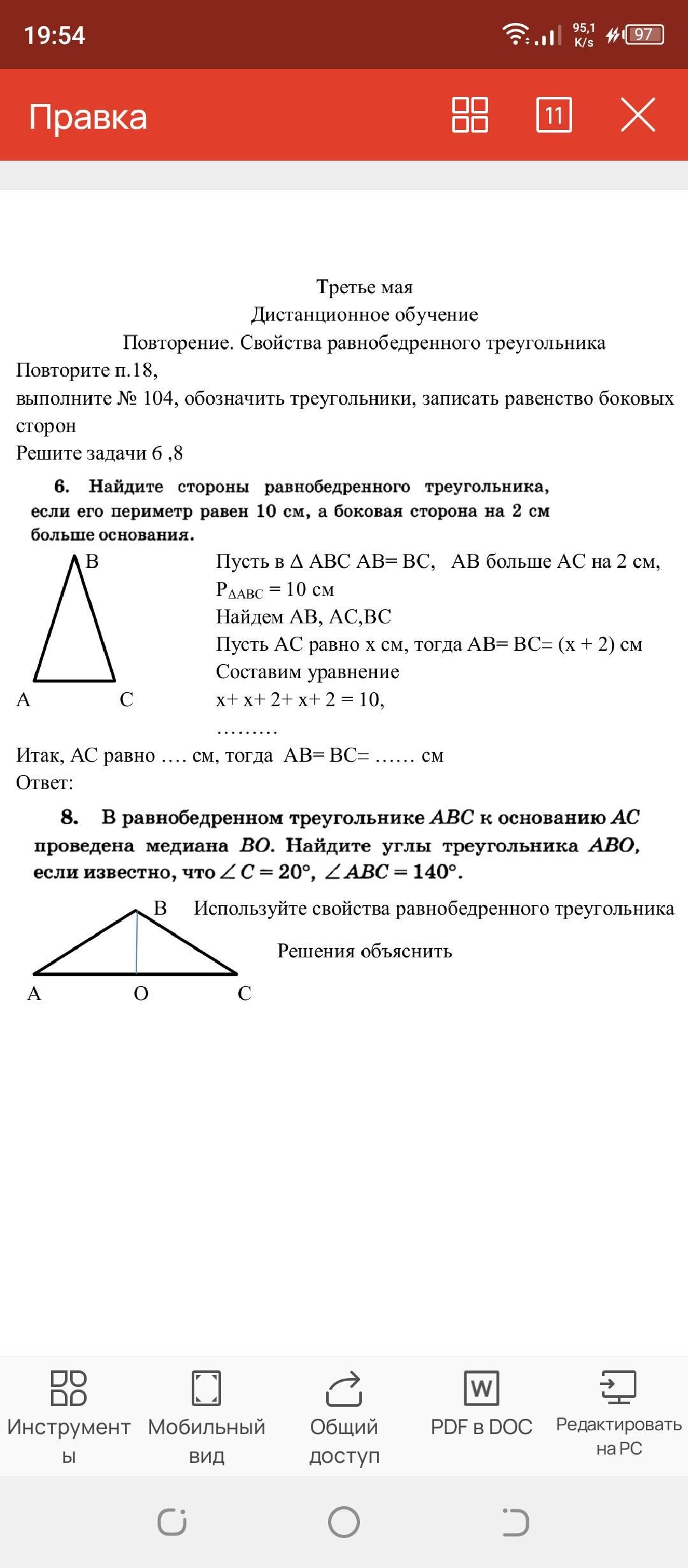 8) ... в равнобедренном треугольнике углы при основании равны, значит, угол А= 20°