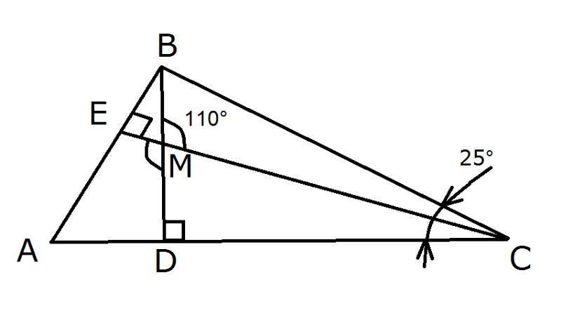 Угол EMD равен углу BMC как вертикальный. Сумма всех углов в четырёхугольнике равна 360 градусам. Поскольку CE и BD высоты, то углы AEC и BDA прямые (90 градусов). Значит, угол BAC равен