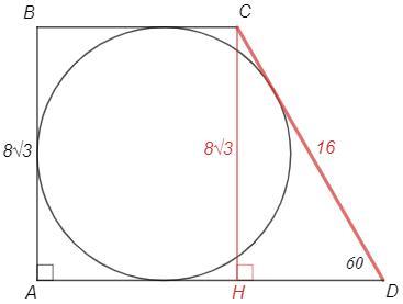 меньшая боковая сторона прямоугольной трапеции равна 8 корней из 3 см,а острый угол 60 градусов .Найдите площадь трапеции ,если известно,что в неё можно вписать окружность