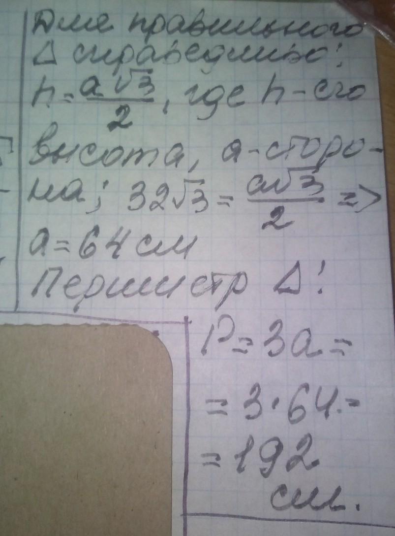 Высота равностороннего треугольника равна 32√3 см. Найди его периметр (запиши только число).