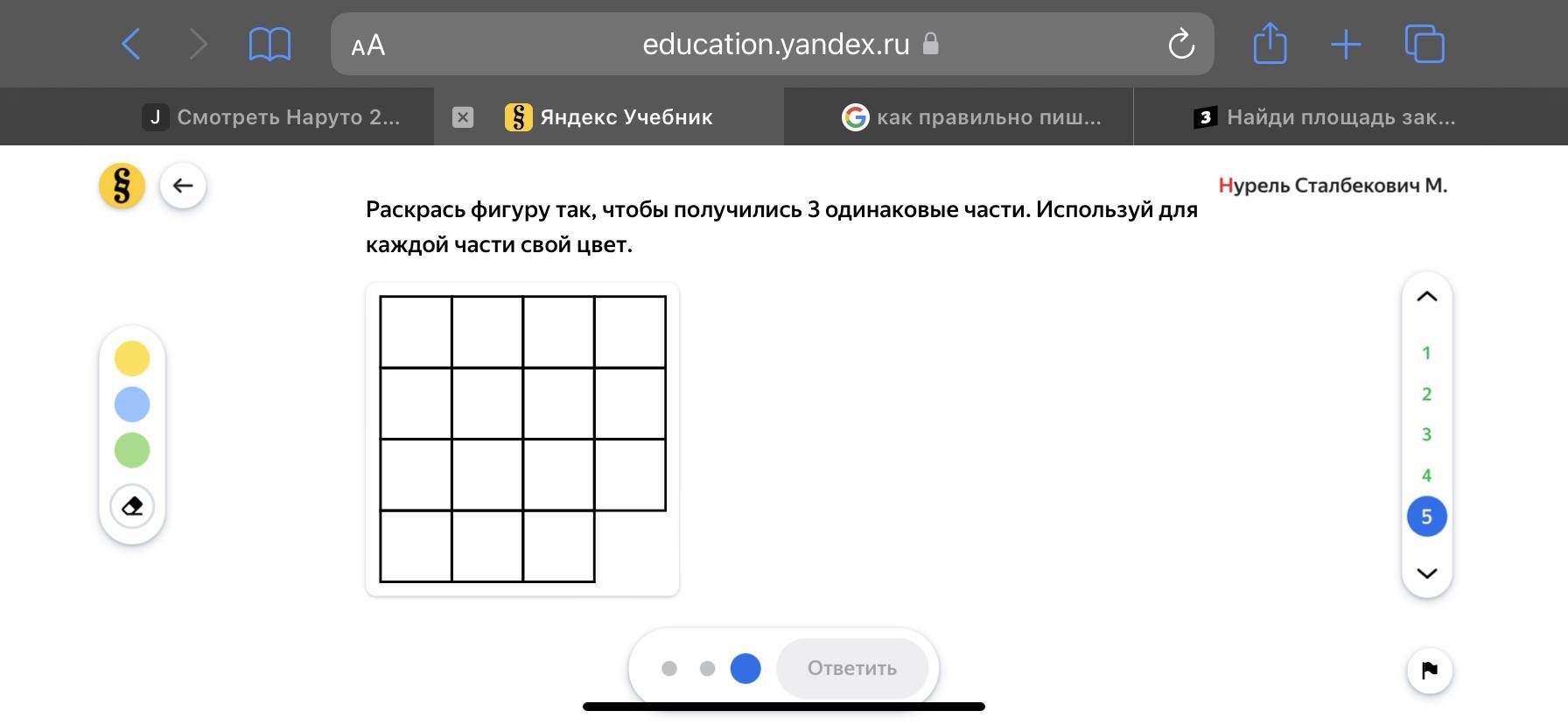 Раскрась фигуру так, чтобы получились 3 одинаковые части. Используй для каждой части свой цвет