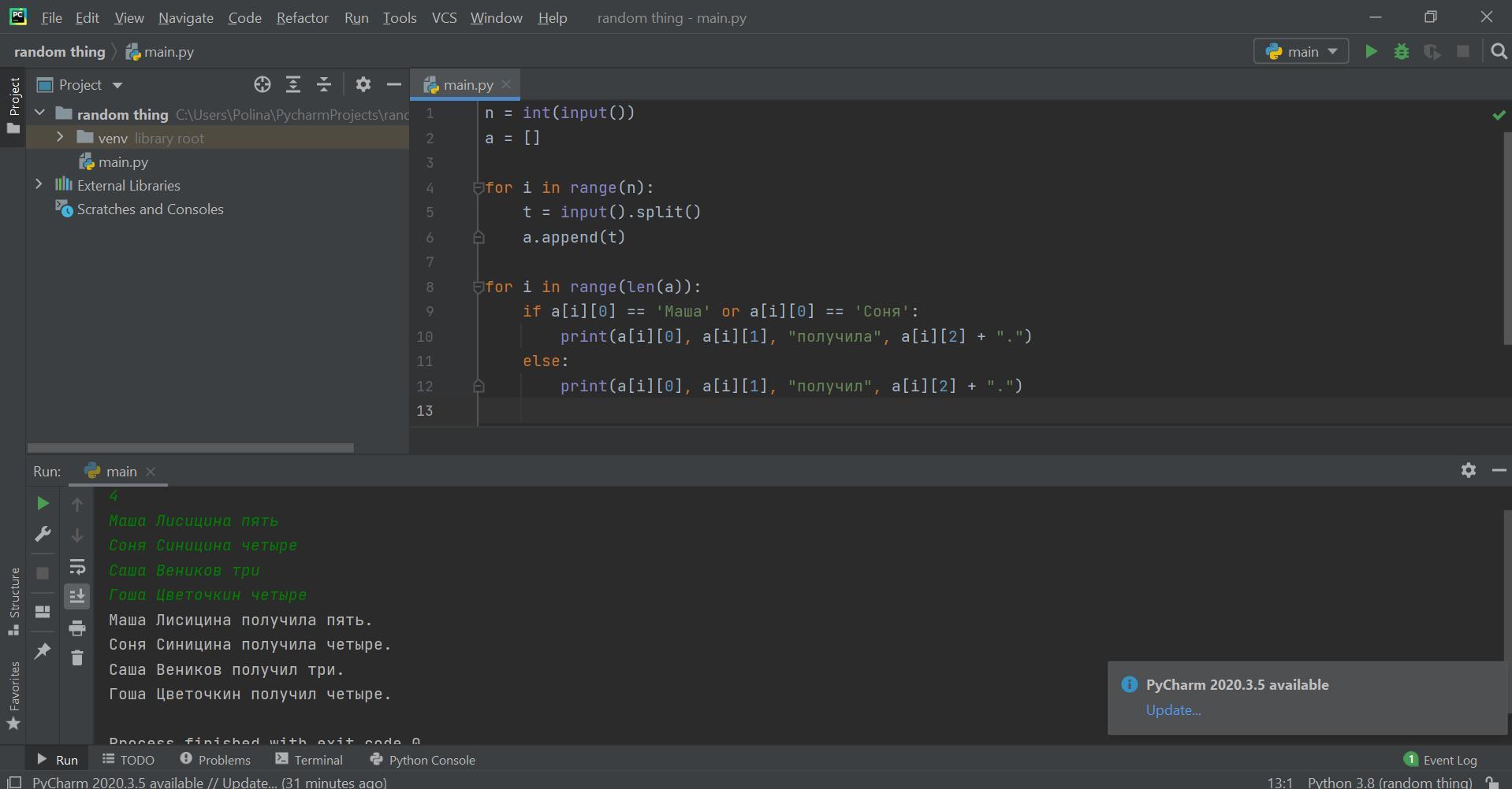 Потом в цикле идем по списку а. Известно, что первое слово в каждой строке - это имя, т.е. это нулевой элемент каждой строки. По имени надо определить, какое слово пишем: "получил" или "получила".