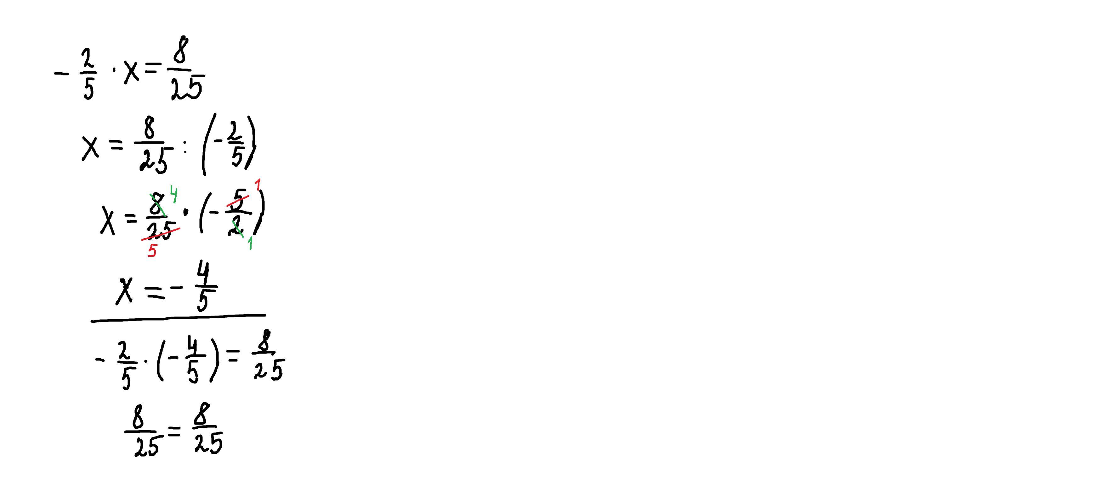 x = - 8/25 * 5/2 = - 4/5 = - 0,8