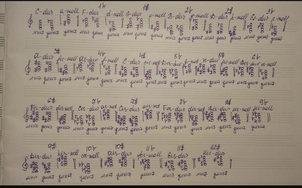 Построения Вы можете увидеть во вложении. Тут построены вводные септаккорды во всех, как Вы и просили, тональностях. В музыкальных школах обычно проходят тональности, в которых от 1 до 7 знаков при ключе; тональности от 8 знаков альтерации и выше являются неиспользуемыми. Но септаккорды в них все же построены, дабы соблюдать условие.