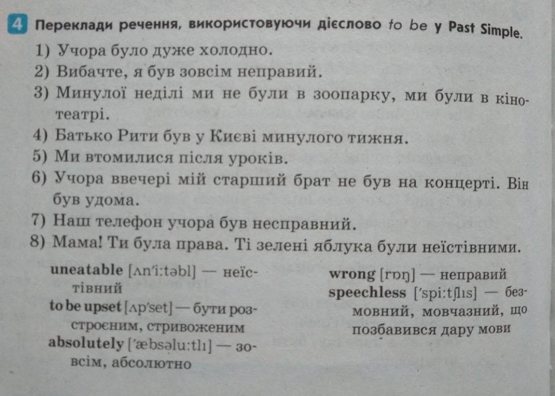 4) Rita's father was in Kyiv last week. 5) We are tired after lessons.