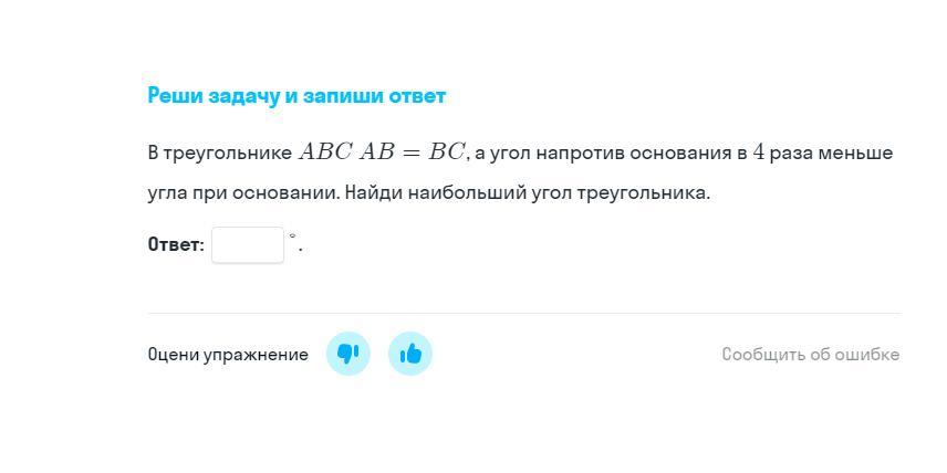 Треугольник АВС равнобедренный. Угол при вершине в 4 раза больше угла при основании. Возьмём угол при основании за х, тогда угол при вершине равен 4х. Сумма всех углов равна х+х+4х=6х. Также мы знаем что сумма всех углов треугольника равна 180 градусов. Значит х=180:6=30. Наибольший угол у нас при вершине равен 4х, то есть 4*30=120 градусов