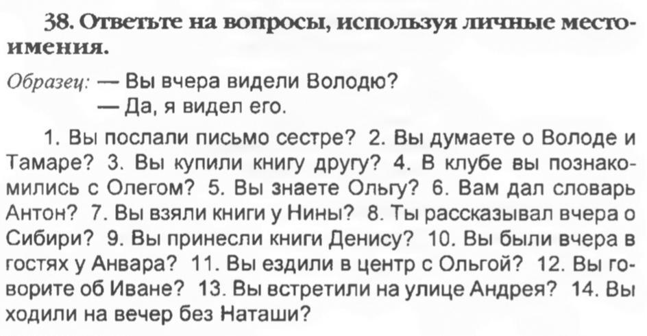 38. Ответъте на вопросы, используя личные место- имения. Образец: — Вы вчера видели Володю? — Да, я видел его. 1. Вы послали письмо сестре? 2. Вы думаете о Володе и Тамаре? 3. Вы купили книгу другу? 4. В клубе вы познако- мились с Олегом? 5. Вы знаете Ольгу? 6. Вам дал словарь Антон? 7. Вы взяли книги у Нины? 8. Ты рассказывал вчера о Сибири? 9. Вы принесли книги Денису? 10. Вы были вчера в гостях у Анвара? 11. Вы ездили в центр с Ольгой? 12. Вы го- ворите об Иване? 13. Вы встретили на улице Андрея? 14. Вы ходили на вечер без Наташи?