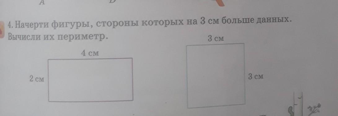На рисунке изображен прямоугольник со сторонами 2 см и 4 см , и квадрат со сторонами 3 см .Если стороны прямоугольника увеличить на 3 см , то они станут 2+3=5 см 4+3= 7 см Формула периметра Р= 2*(a+b)Р= 2*(5+7)=2*12=24 см - периметр прямоугольника Если стороны квадрата увеличить на 3 см , то они будут 3+3 = 6 см Формула периметра Р=4аР= 4*6= 24 см - периметр квадратарисунок во вложении