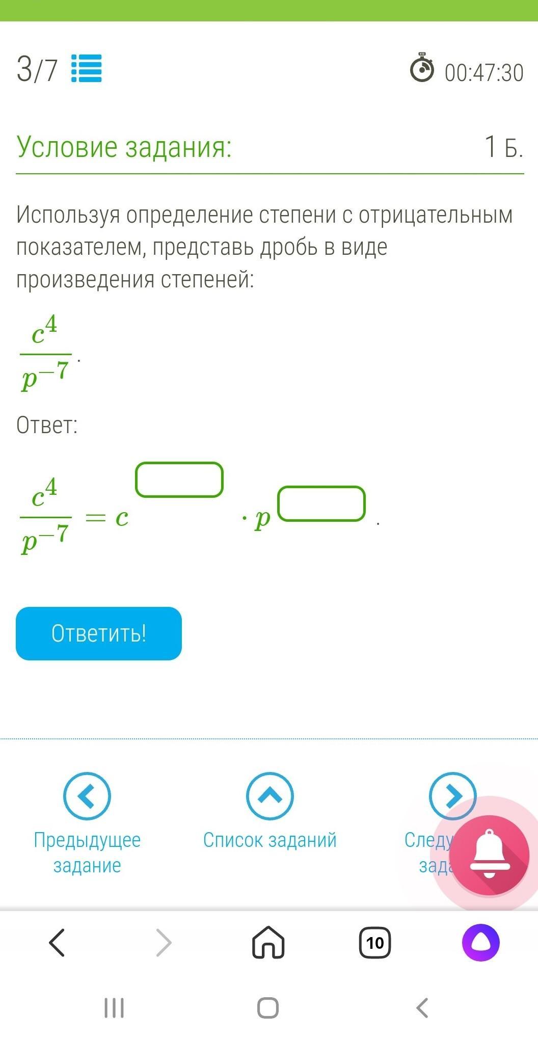 с^4•р^7 Если отрицательный показатель в знаменателе,тоон иде в числитель положительным и,наоборот, если в числителе,тоидет в знаменатель роложительным