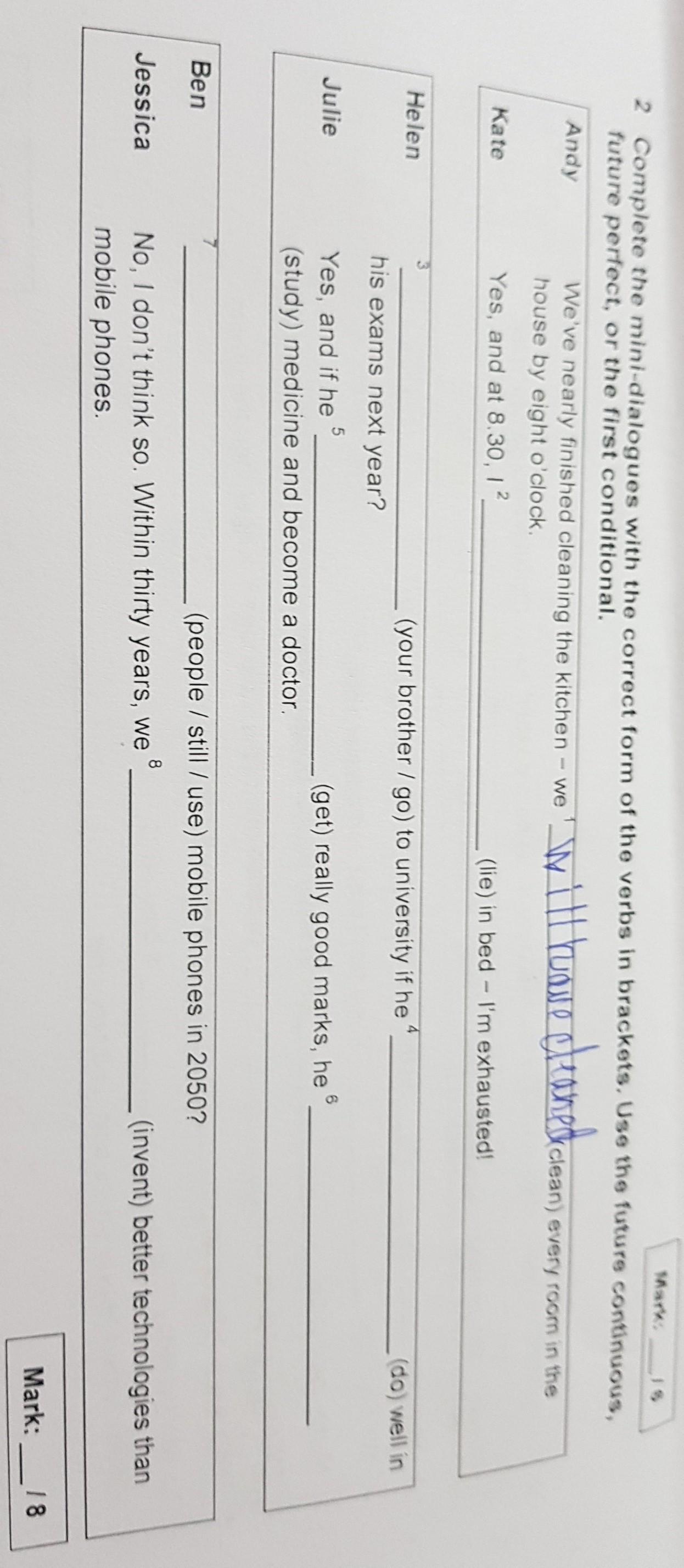 Andy: We’ve nearly finished cleaning the kitchen − we 1) will have cleaned every room in the house by eight o’clock. (К опр.времени в будущем-Future Perfect)