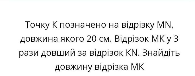 Точку К позначено на відрізку MN, довжина якого 20 см. Відрізок МК у 3 рази довший за відрізок KN. Знайдіть довжину відрізка MK