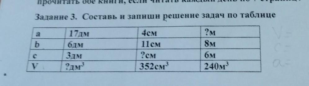 Заданне 3. Составь н занши решение задач по таблице 2 b 17ам бам Здм ?ам 4см 11см 2см 352см ?м 8м бм 240м3 с у