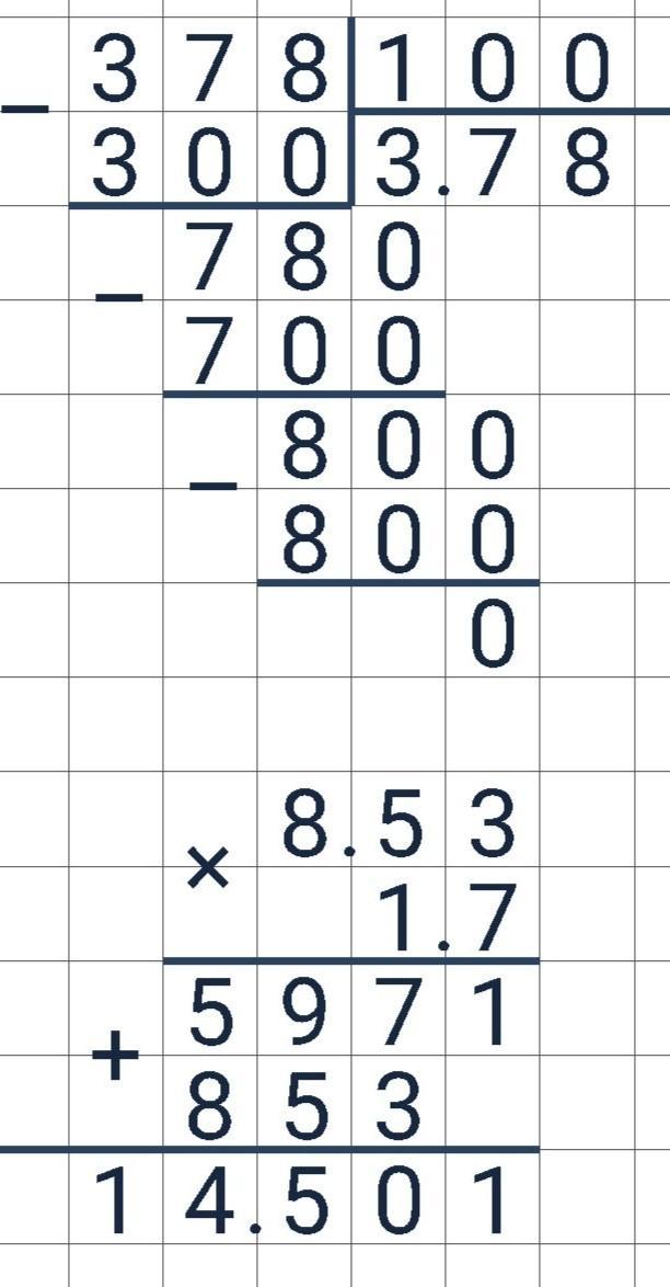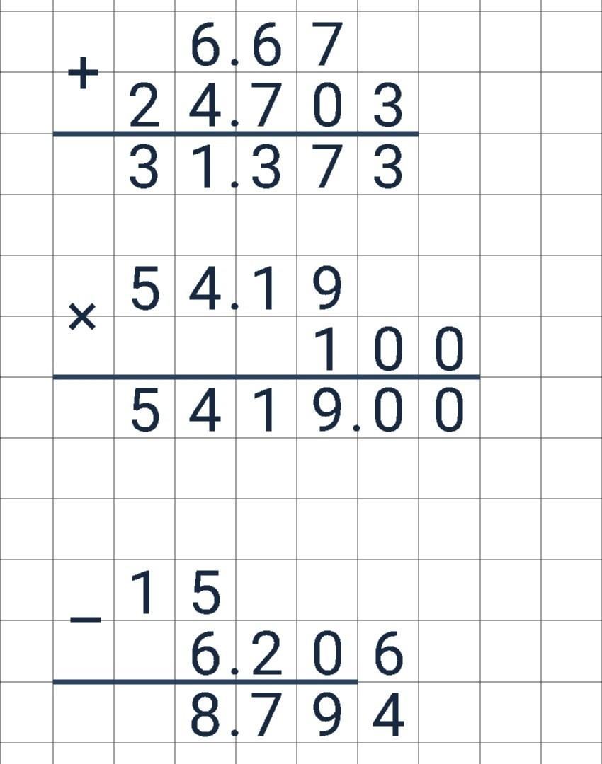 1.Вычислить: 1) 6,67 +24,703; 4)54,19×100 2) 15 - 6,206; 5)37,8:10 3) 8,53×1,7; 6 )84,28:14 Столбиком