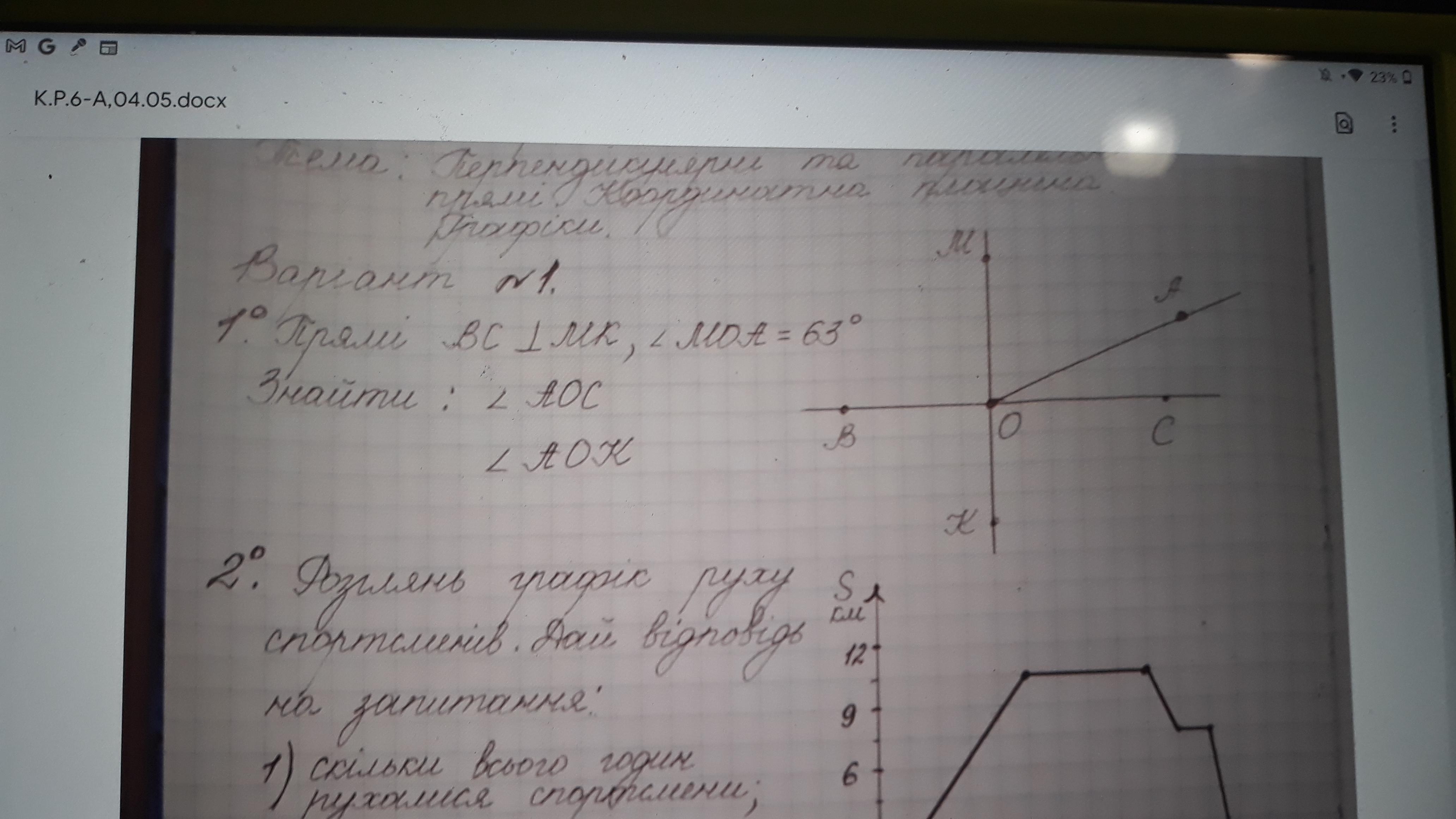 Угол MOC = 90 градусов. Вычитаем из него известный угол MOA, остаётся искомый угол AOC