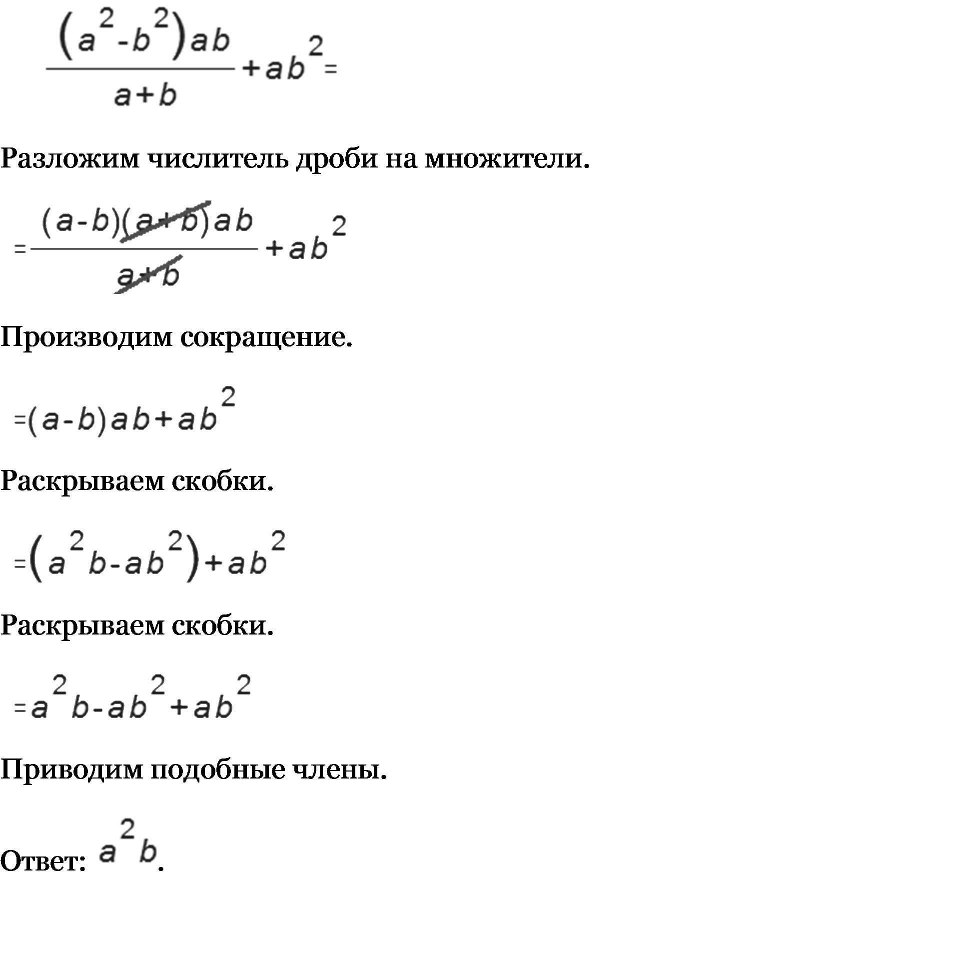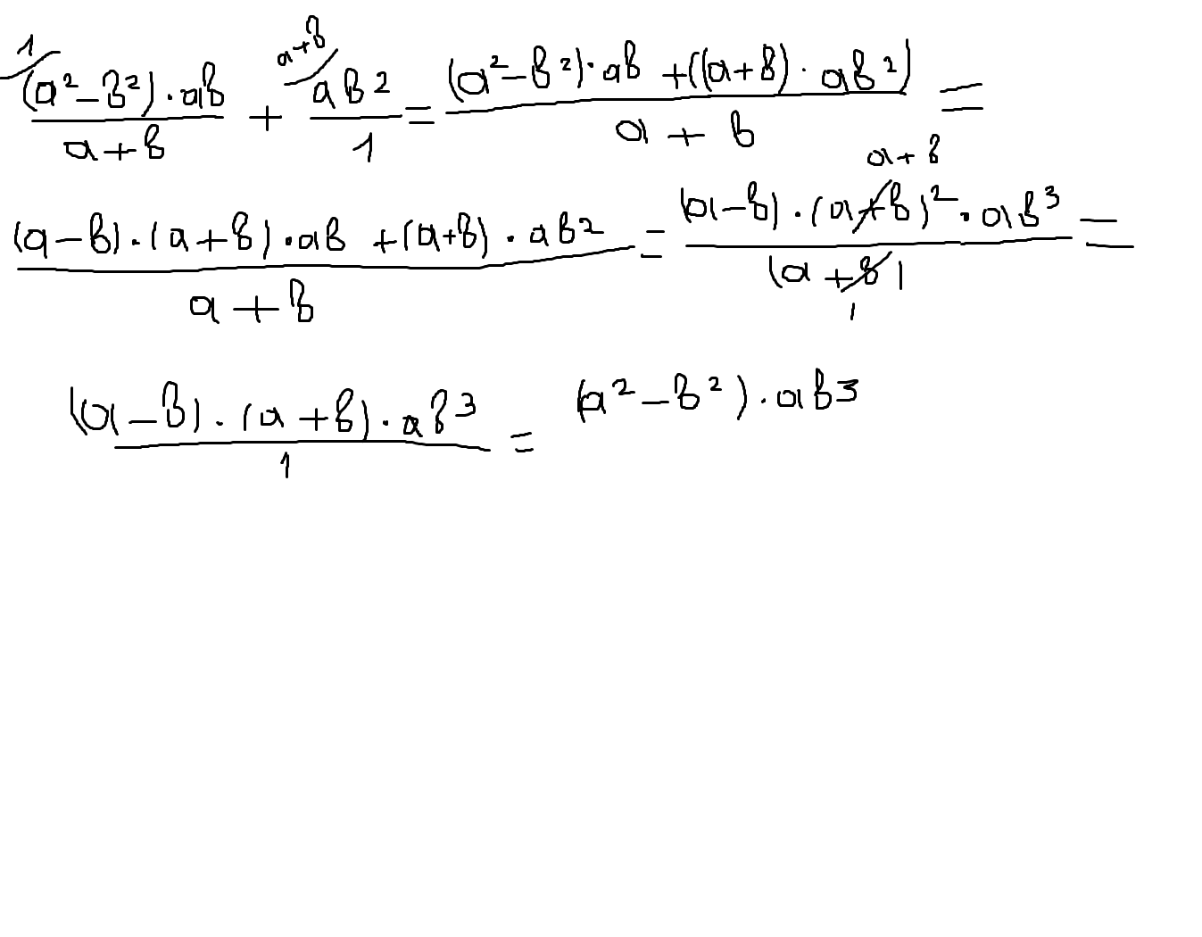 упростите выражение!!!(a2-b2)ab разделить на a+b и к этой дроби прибавить ab2 пожалуйста с объяснением!!!