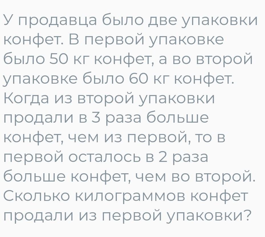 У продавца было две упаковки конфет. В первой упаковке было 50 кг конфет, а во второй упаковке было 60 кг конфет. Когда из второй упаковки продали в 3 раза больше конфет, чем из первой, то в первой осталось в 2 раза больше конфет, чем во второй. Сколько килограммов конфет продали из первой упаковки?