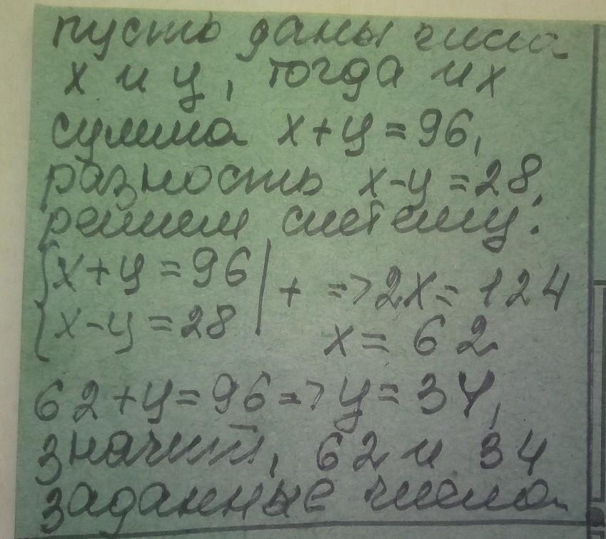 Сумма двух чисел равна 96, а их разность равна 28. Найдите эти числа. Прогу срочно, дам много баллов.