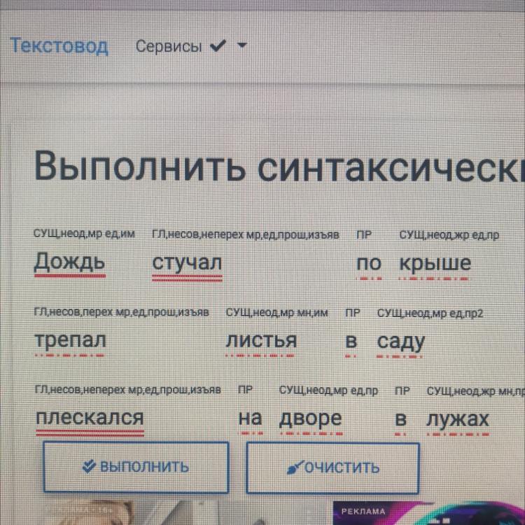 ПОМОГИТЕ ПОЖАЛУЙСТА синтаксический разбор предложения дождь стучал по крыше ,трепал листья в саду , плескался на дворе в лужах