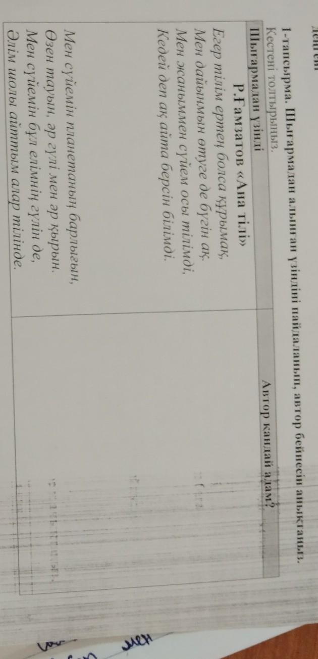 1-тапсырма. Шығармадан алынған үзіндіні пайдаланып, автор бейнесін анықтаңыз. Кестені толтырыңыз.