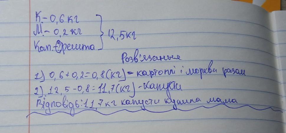 Мама купила 12,5 кг овочів. Картопля становила 0,6 усіх овочів, а морква - 0,2 усіх овочів, решта - капуста. Скільки капусти купила мама? Записати алгоритм розв'язання задачі.