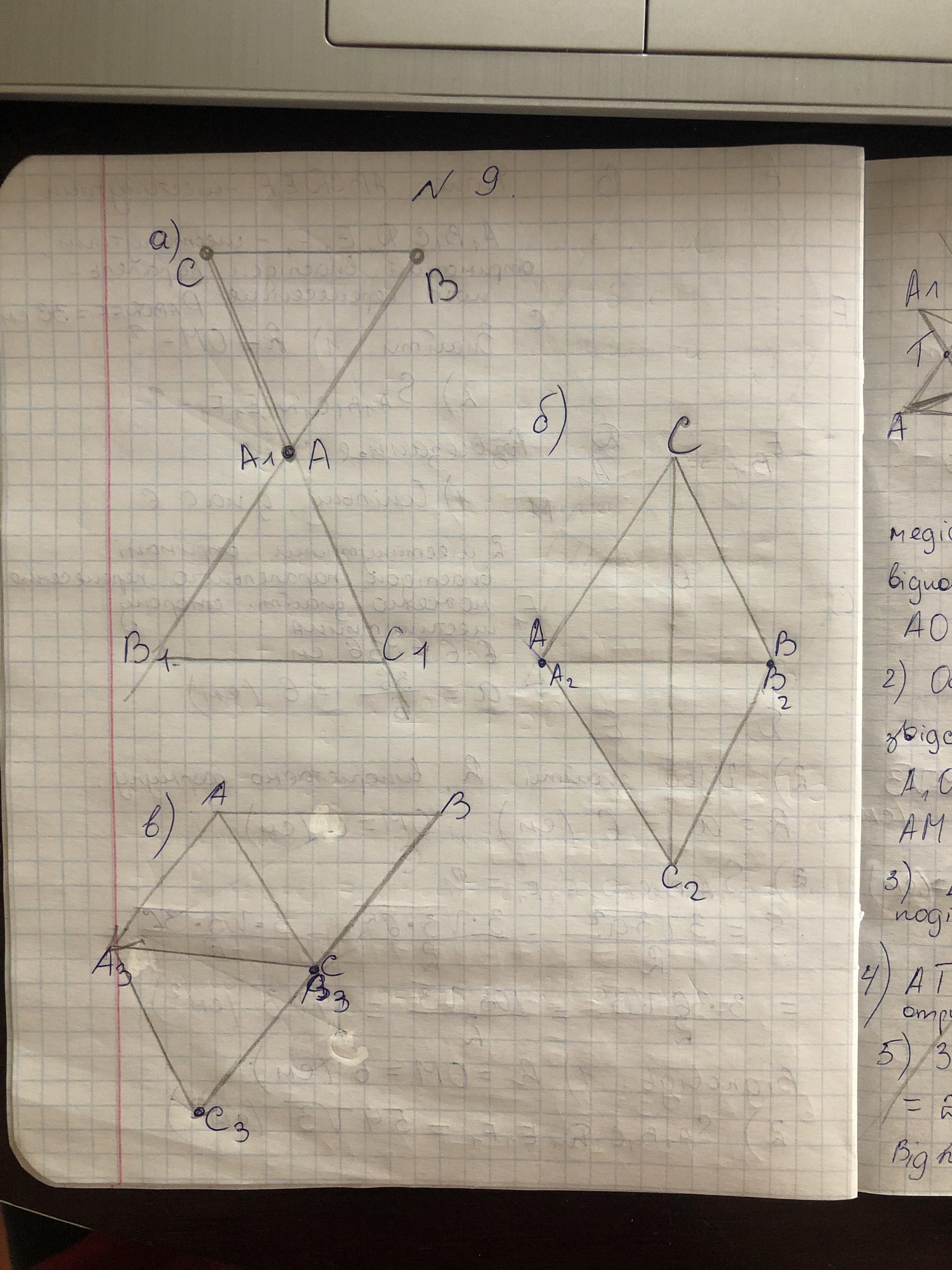 Накресліть трикутник ABC. Побудуйте а) трикутник A¹B¹C¹ отриманий у результаті симетрії трикутника ABC відносно точки A; б) трикутник A²B²C² отриманий у результаті симетрії трикутника ABC відносно прямої AB; в) Трикутник A³B³C³ отриманний у результаті паралельного перенесення трикутника ABC на вектор BC ->