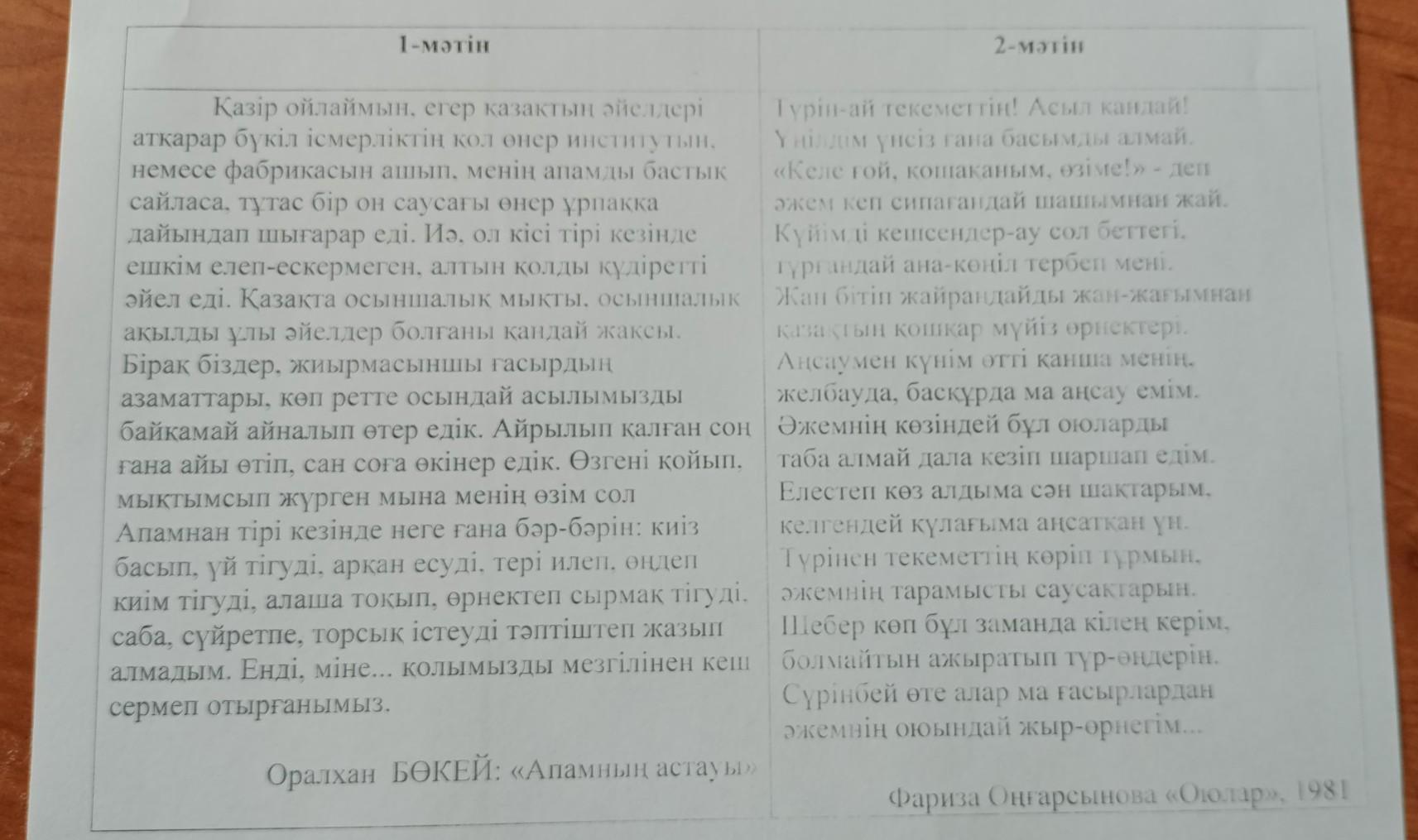 №1 тапсырма: Мәтіндерді төмендегі аспектілері бойынша талдаңыз. Екі мәтіннің стилін, жанрын, тақырыбын, мазмұнын салыстырыңыз.