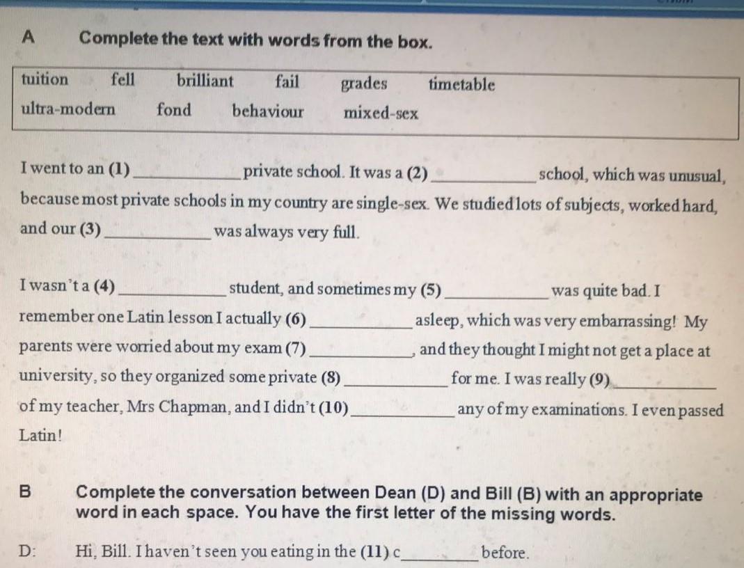 I wasn't a 4) brilliant student, and sometimes my 5) behavior was quite bad. I remember one Latine lesson I actually 6) fell asleep, which was very embarassing! My parents were worried about my exam 7) grades, and they thought I might not get a place at university, so they organized some private 8) tuition for me. I was really 9) fond of my teacher, Mrs Chapman, and I didn't 10) fail any of my examinations. I even passed Latin!