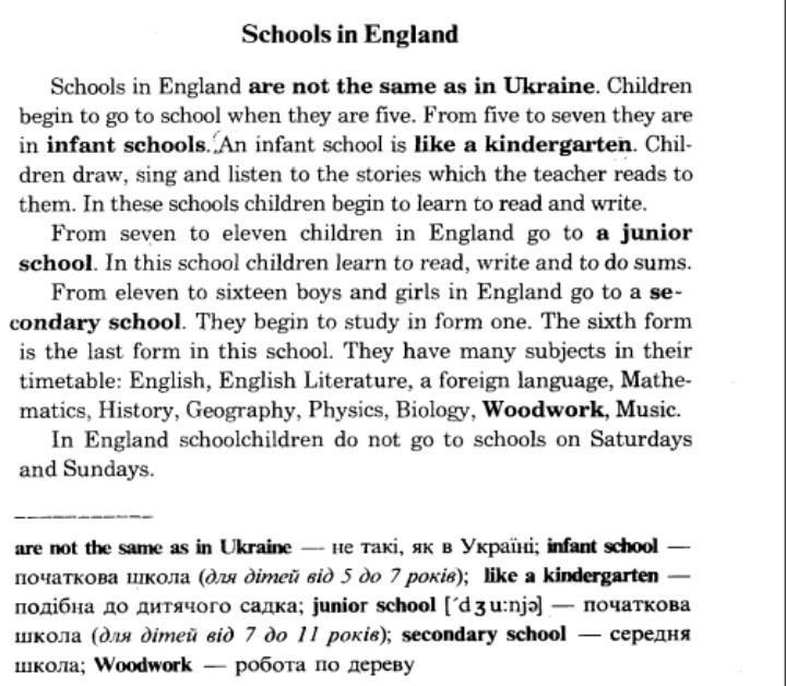 1. What kinds of schools are there in England? 2. When do chil- dren begin to go to an infant school? 3. What do children do at an infant school? 4. When do children begin to go to a junior school? 5. What do children learn to do at a junior school? 6. When do chil- dren begin to go to a secondary school? 7. What subjects do chil- dren learn at a secondary school?