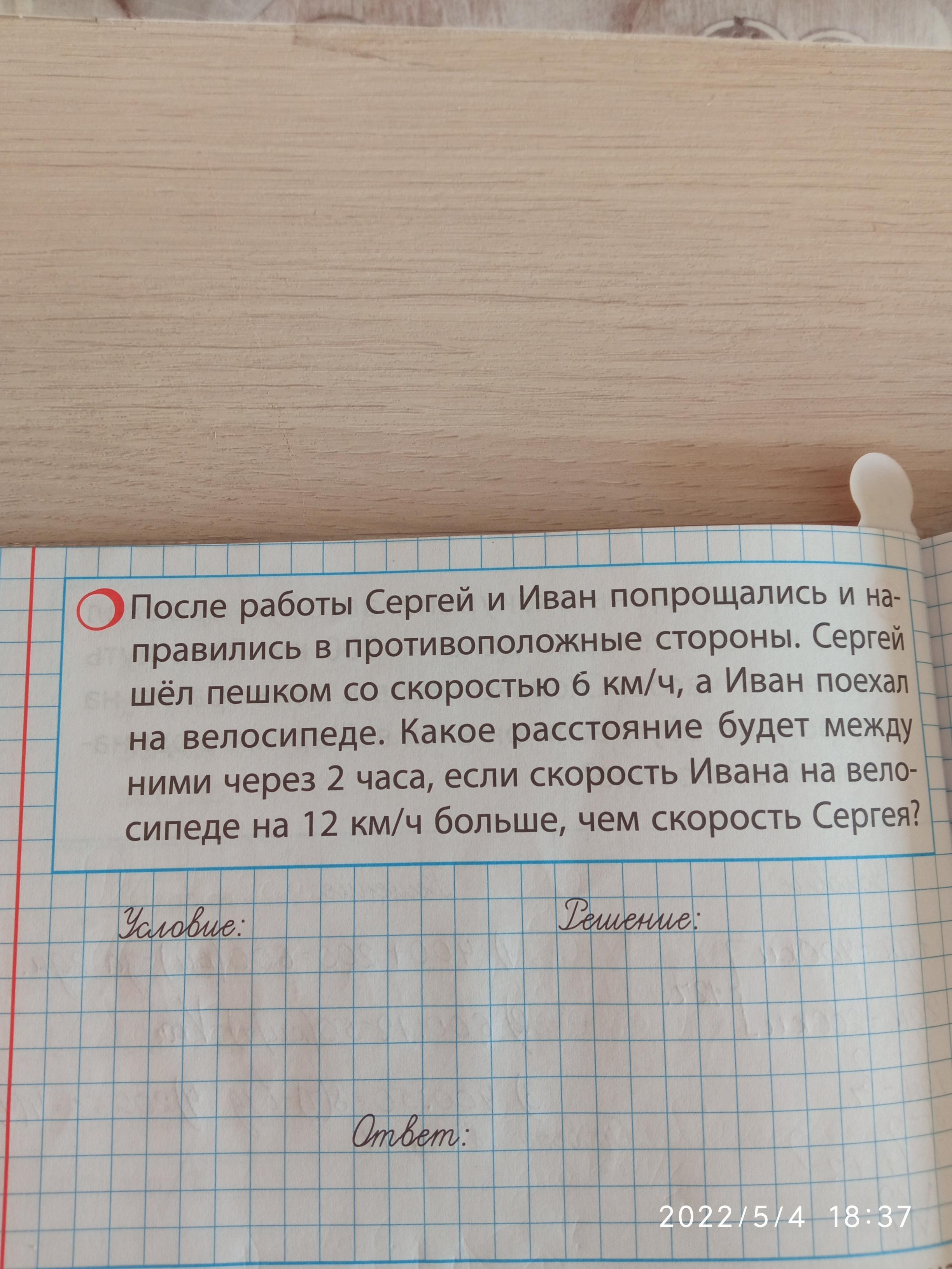 После работы Сергей Иван попрощались и направились в противоположные стороны Сергей шел пешком со скоростью 6 км ч а Иван поехал на велосипеде Какое расстояние будет между ними через 2 часа если скорость Ивана на велосипеде на 12 км ч больше чем скорость Сергея