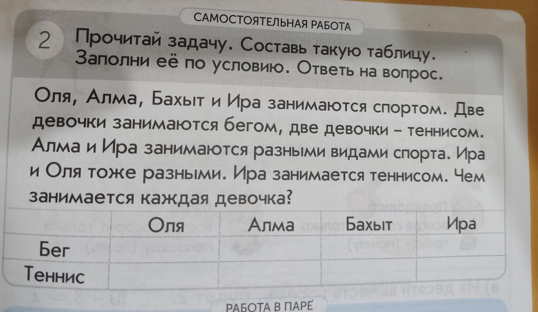 САМОСТОЯТЕЛЬНАЯ РАБОТА 2 Прочитай задачу. Составь такую таблицу. Заполни её по условию. Ответы на вопрос. Оля, Алма, Бахыт и Ира занимаются спортом. Две девочки занимаются бегом, две девочки – теннисом. Алма и Ира занимаются разными видами спорта. Ира и Оля тоже разными. Ира занимается теннисом. Чем занимается каждая девочка? Оля Алма Бахыт Ира Бег Теннис